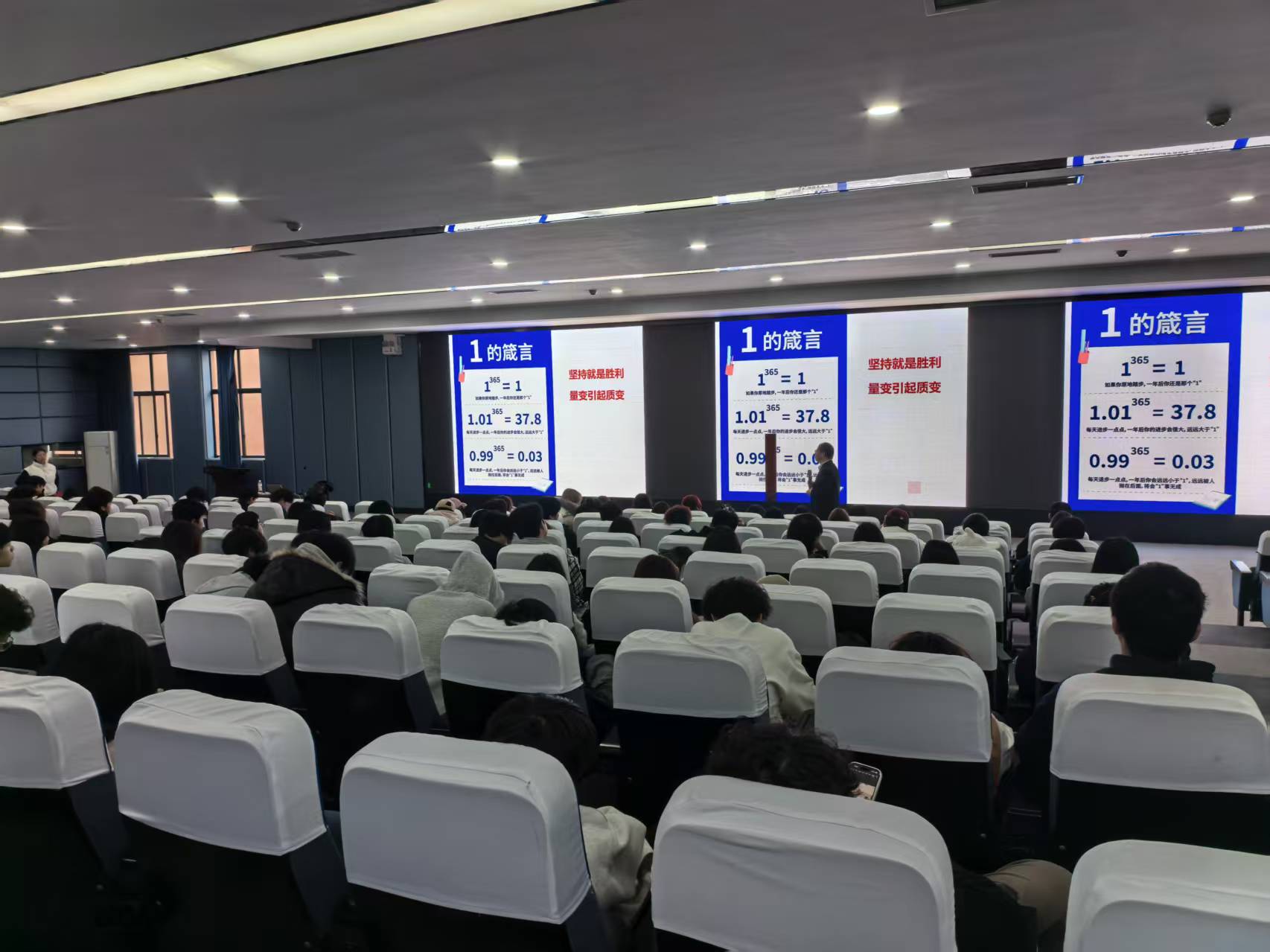 互动环节,同学们围绕“商贸谈判情绪稳定”、“融媒体团队协作需求感知”提问。邢老师以“棉花糖实验”讲延迟满足,用“1的箴言”喻坚持价值,逐一解答,现场氛围热烈。
